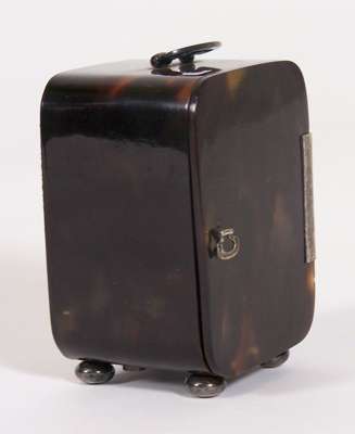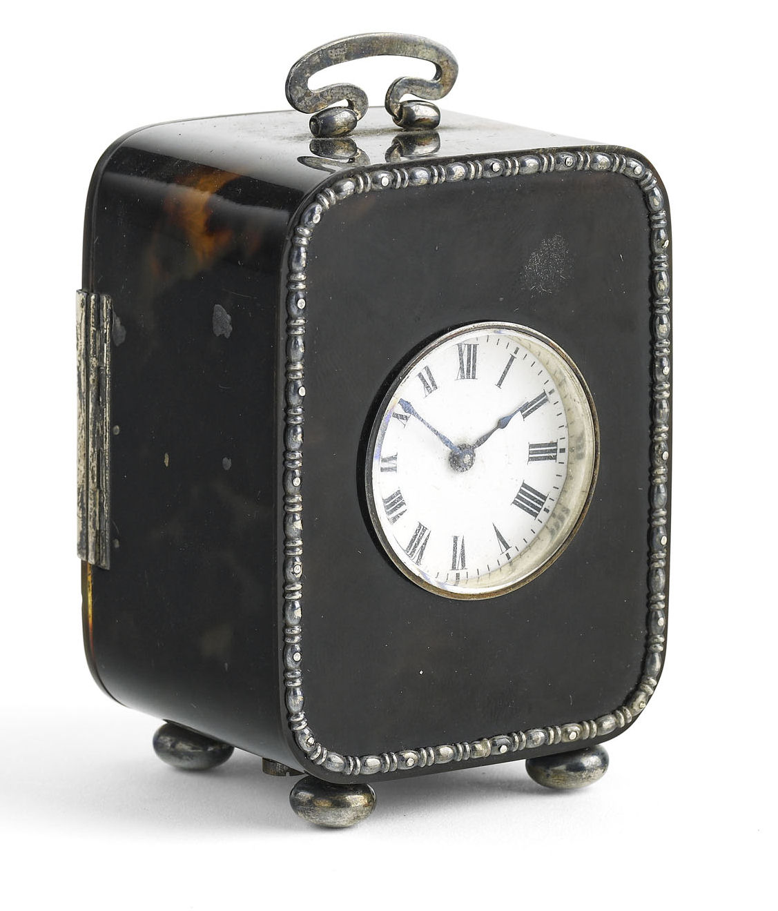 of rounded rectangular form with roman dial and bead and reel framed edge, hinged stamped 'L&S, Sterling', with swing handle, on bun feet, French movement