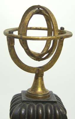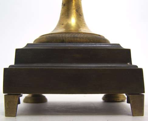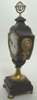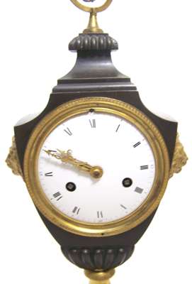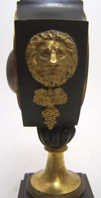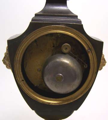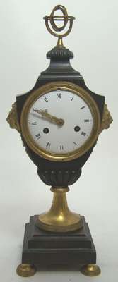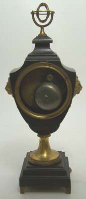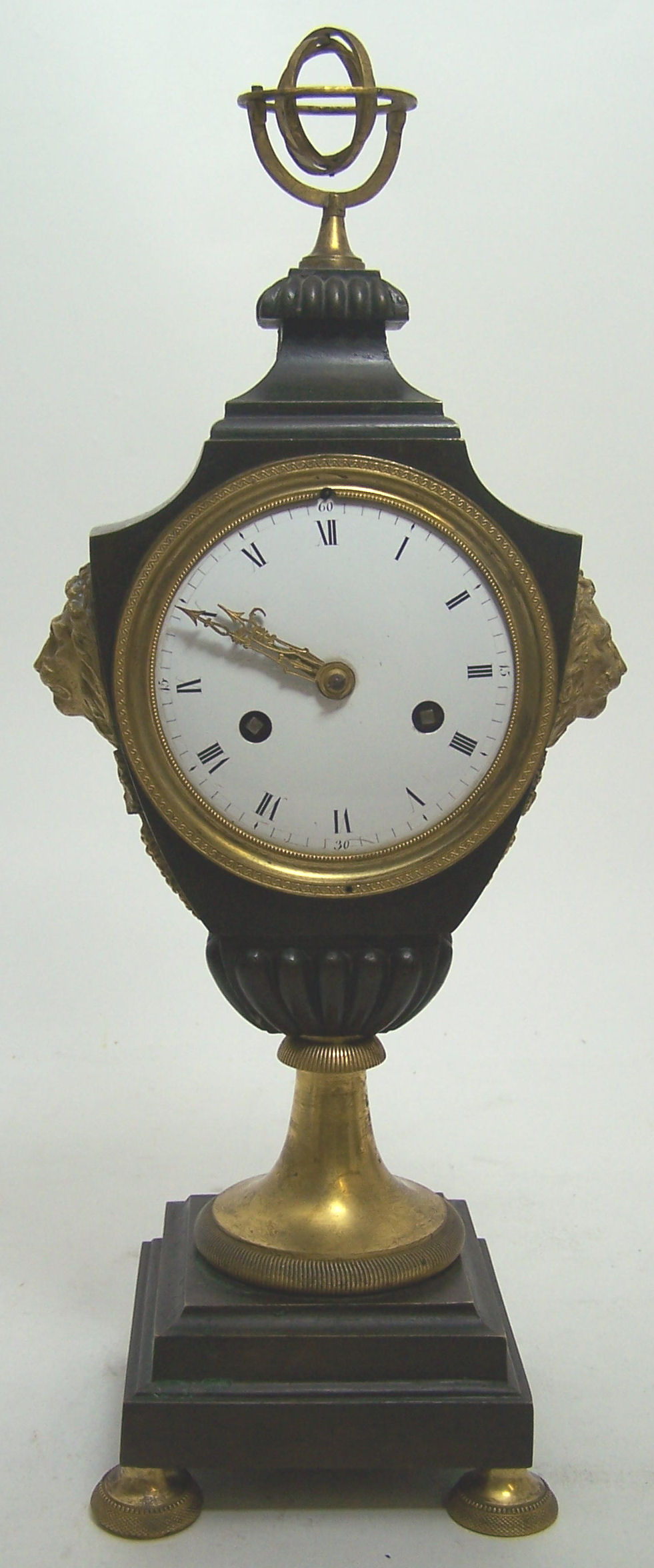 of vase form, the white enamel dial with a bell striking eight day movement, surmounted by an astrolabe finial and flanked by lions mask motifs, raised on a socle base with engine turned toupie feet