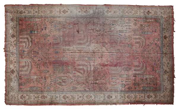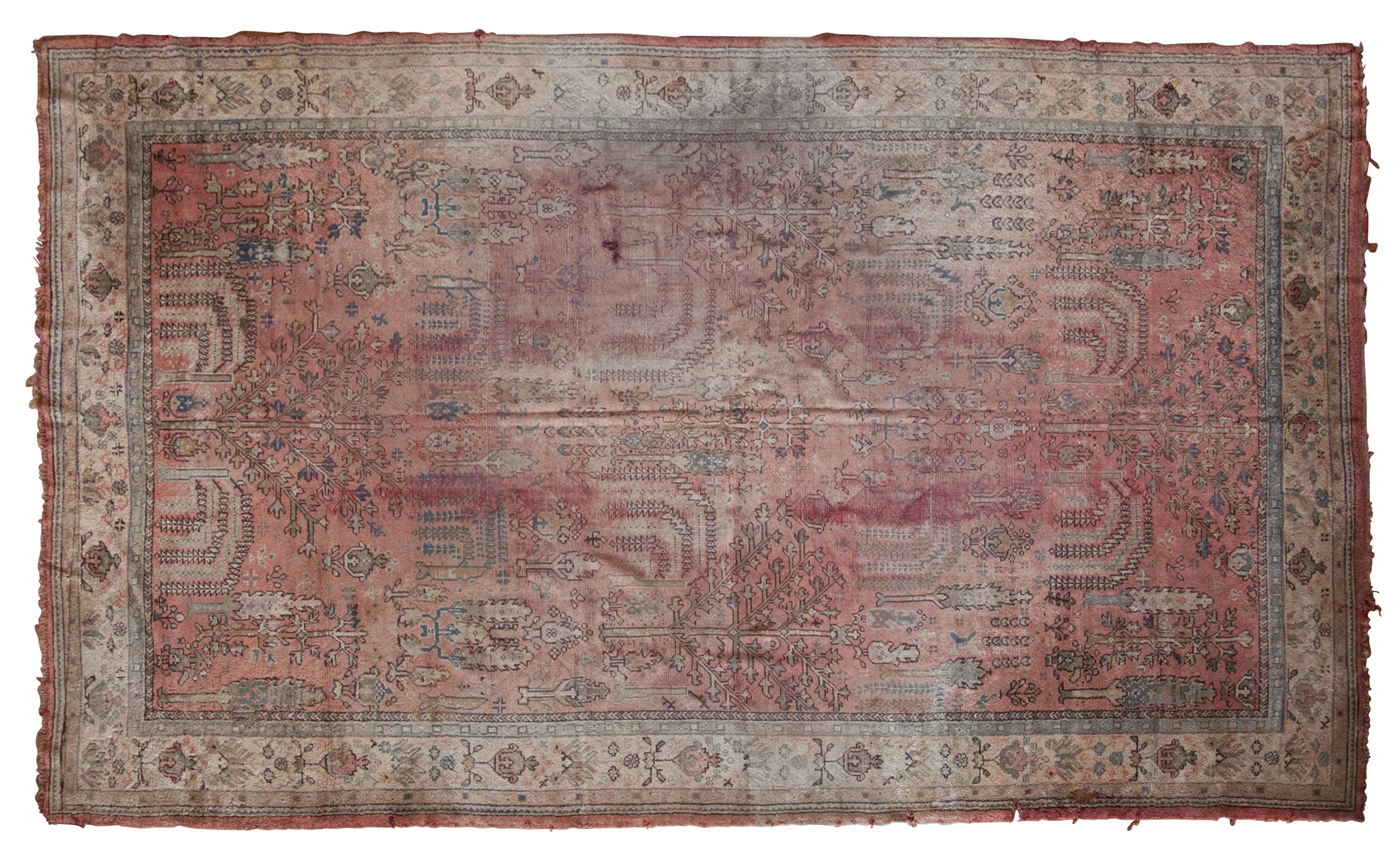 the rose field with allover stylised tree pattern, within cream palmette and foliate border between bands (worn)