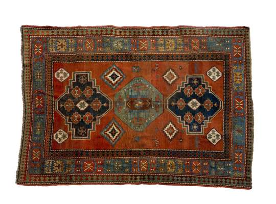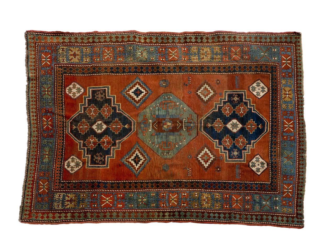 the red field with central green octagonal medallion flanked by two indigo stepped medallions, within blue harshang border between skittle bands