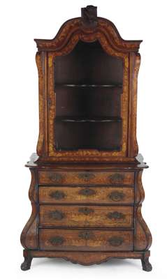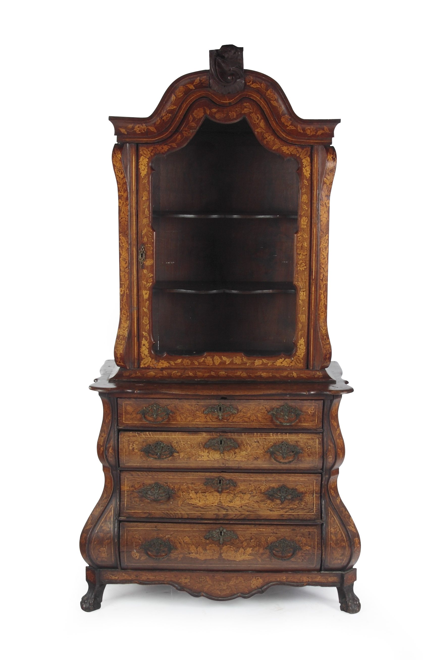 A late 18th century Dutch walnut and floral marquetry display cabinet