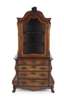 the arched cornice with carved bird cresting above a glazed door and sides, enclosing shelves, the lower part of serpentine bombe outline enclosing four graduated drawers, on shaped apron and claw and ball feet