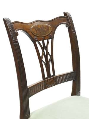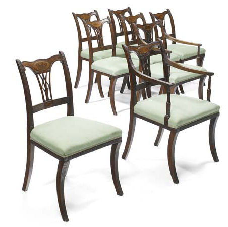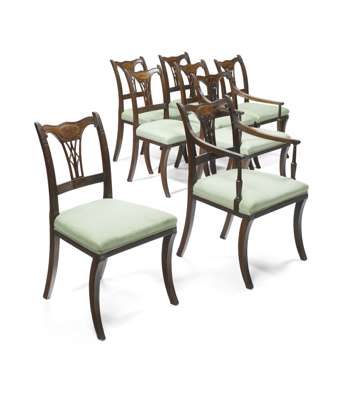 including a pair of carvers, the shaped top rails centred by a raised oval above pierced tapering splats between reeded uprights, mid rails and sabre legs, with green fabric overstuffed seats (8)