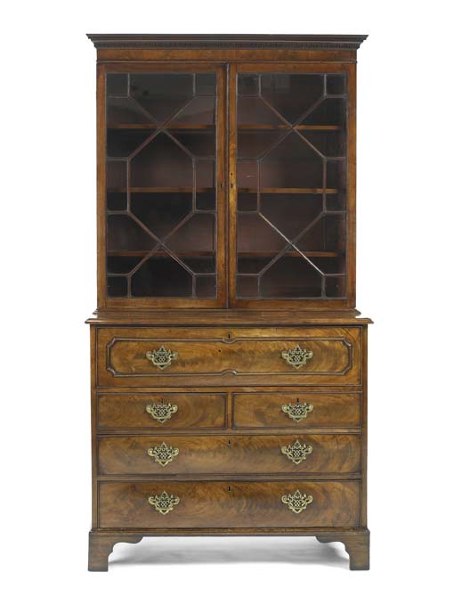 the moulded cornice with a dentil frieze, two astragal glazed panel doors to the upper section enclosing two adjustable shelves, the secretaire drawer with an inlaid interior with a cupboard, pilaster drawers, further drawers and pigeon-holes, tooled leather writing surface, two short and two long drawers below, pierced brass butterfly bail handles, bracket feet