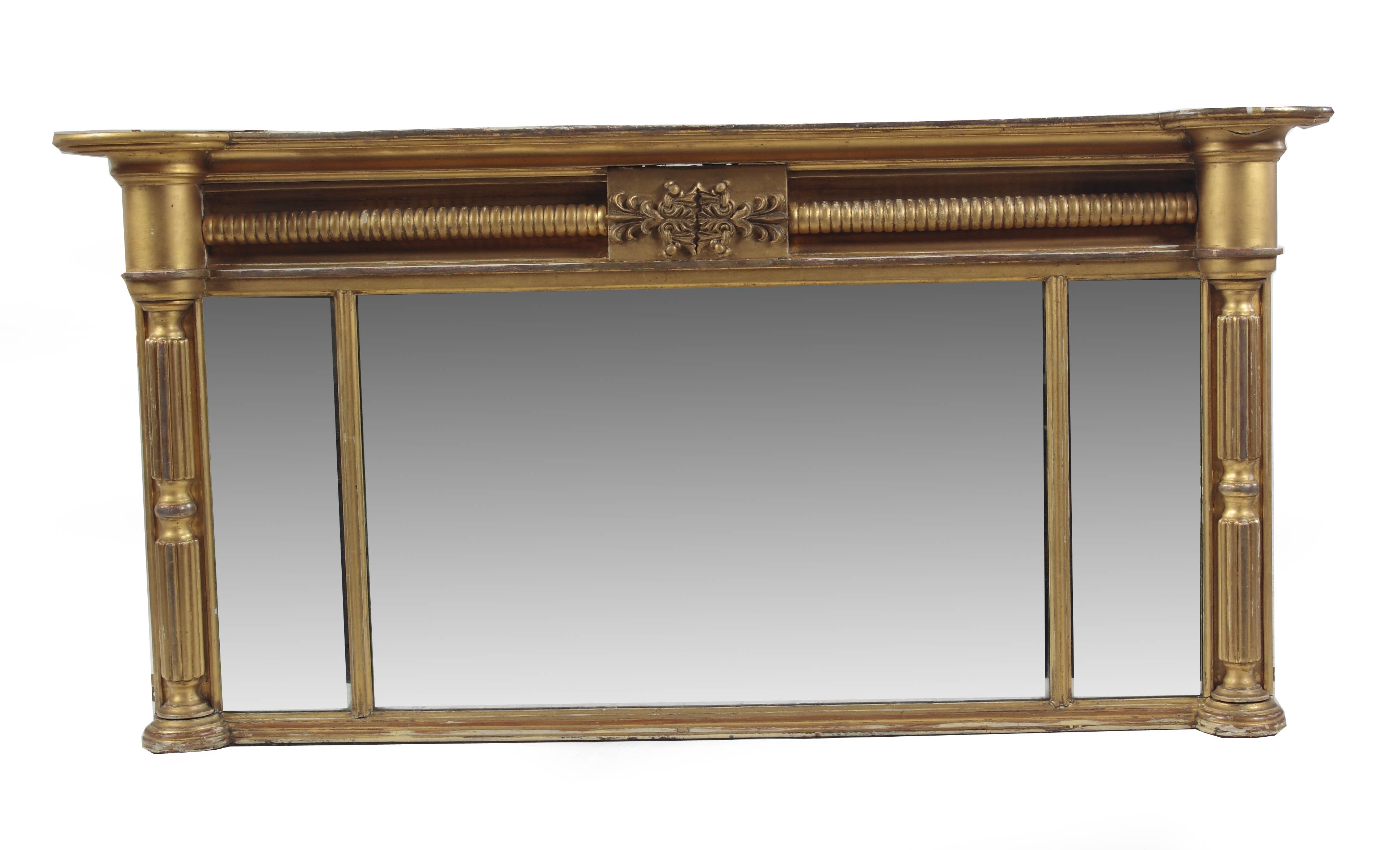 the pediment with projecting corners and reeded columnar frieze centred by a foliate tablet, the plates with giltwood slips flanked by reeded uprights and moulded base