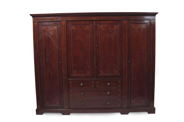 the projecting cornice above two central panel doors enclosing slides above two short and two long graduated drawers with brass pull handles, flanked by two long panelled doors enclosing mirrors verso and hanging spaces, the whole with decorative boxwood line inlay