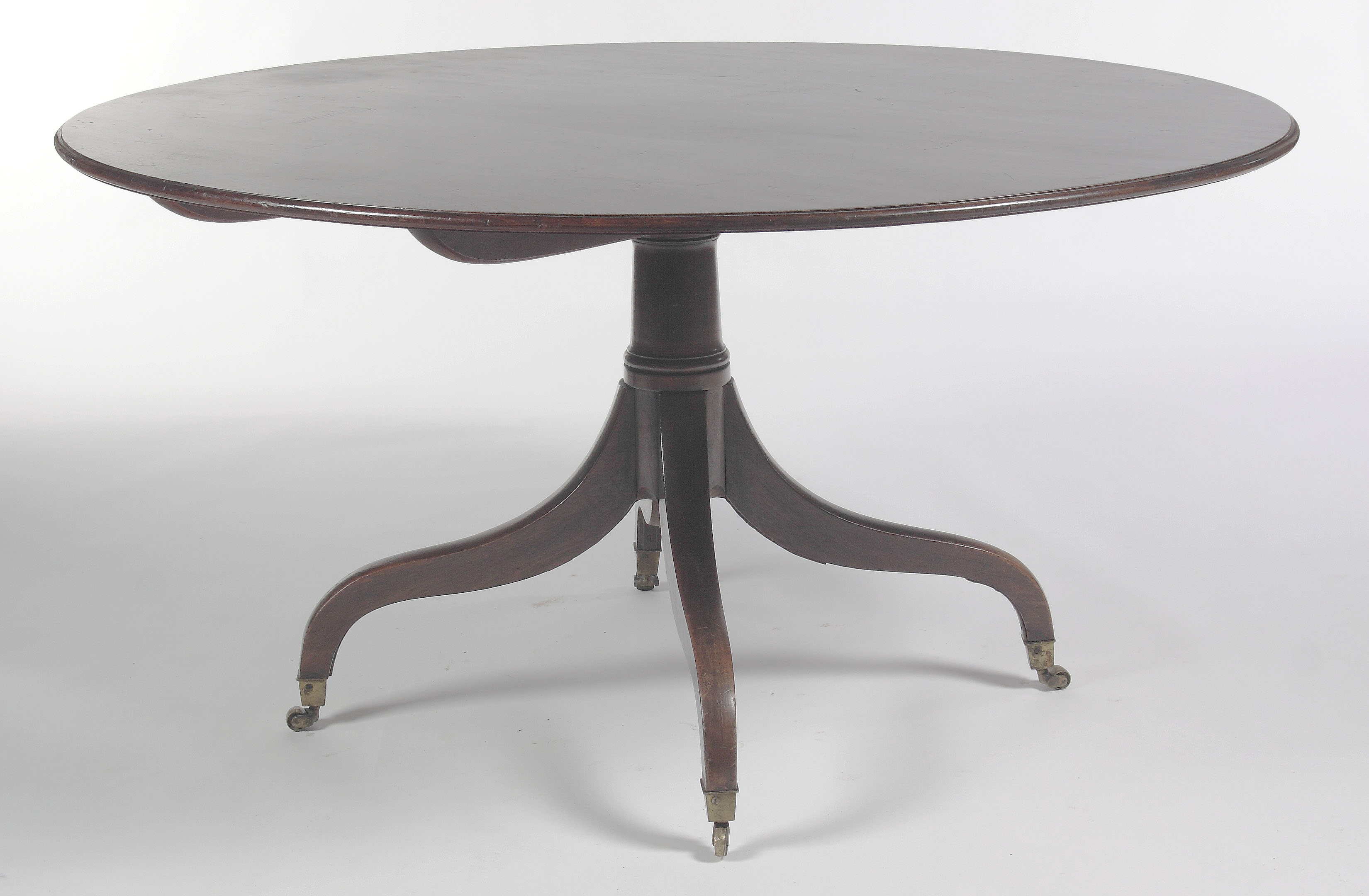 the circular top with moulded edge above a plain baluster column on an inscrolling quadruped base with tapering legs ending in brass box castors