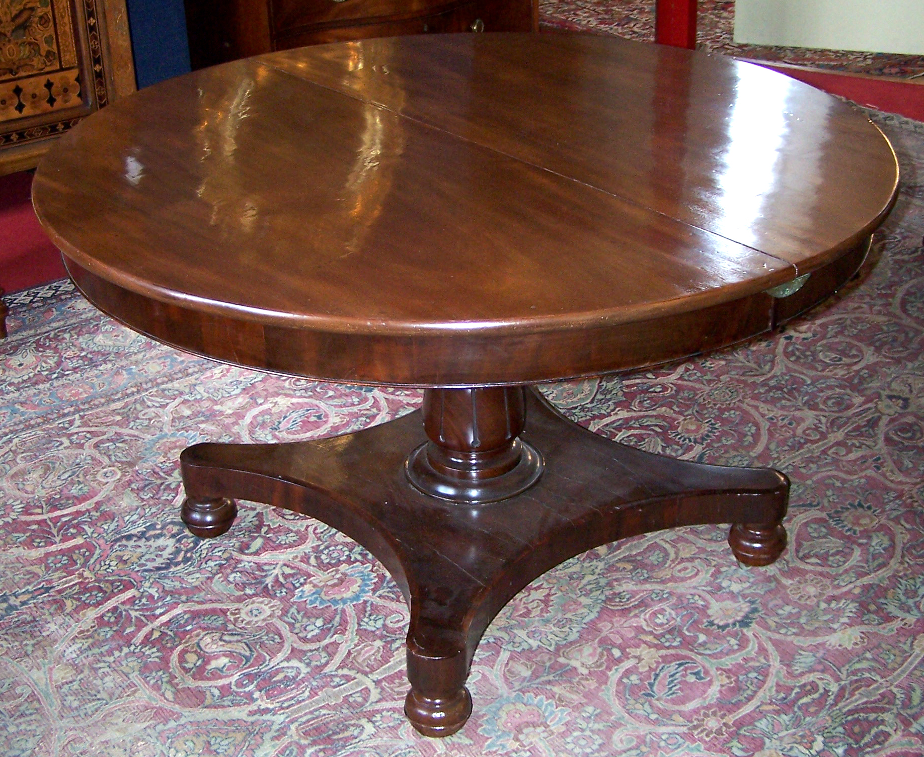 the circular top with three leaf insertions above a lappet carved column and quadrapartite platform base ending in bun feet with recessed castors, including two subsidiary ring-turned support legs