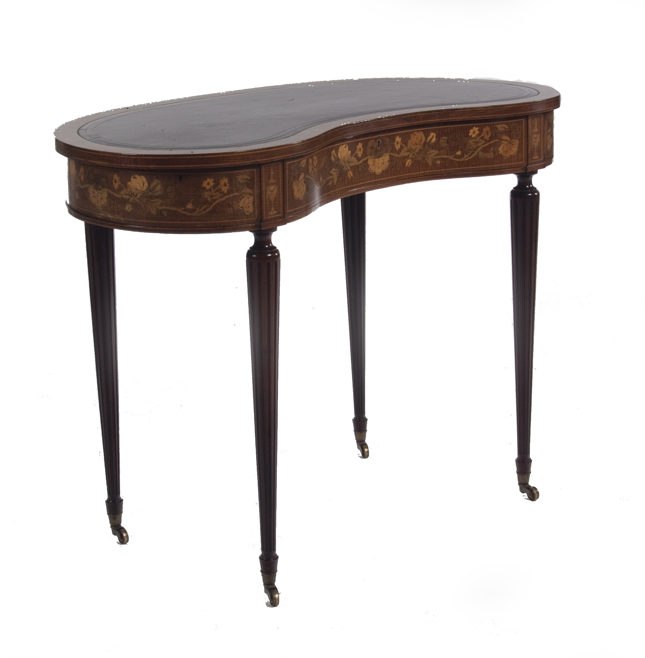 the top with inset skiver above a foliate inlaid frieze with a full width drawer, on turned and fluted tapering legs ending in brass socket castors