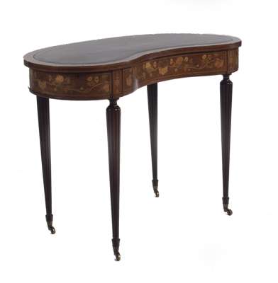 A late 19th century mahogany and floral marquetry kidney-shaped writing table