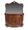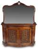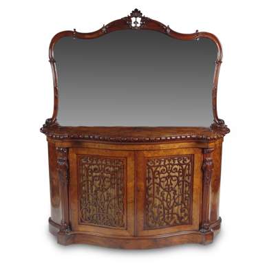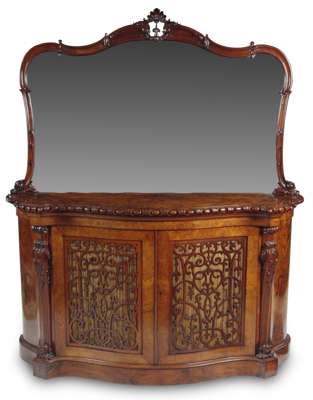 the cartouche shaped mirror back within a leaf scroll carved frame with foliate surmount, the serpentine top with egg and dart carved edge above a pair of silk lined arabesque pierced cupboard doors, between scrolling foliate carved pilasters, on plinth base