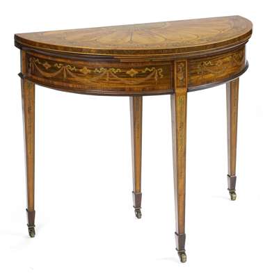 A George III style satinwood, tulipwood, harewood and marquetry foldover card table In the manner of Edwards & Roberts