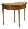 the top with flame-figured match veneers radiating from a fleurs de lys patera within a border of ribbon-tied flowers, enclosing a baize inset, the swagged frieze on similarly inlaid square tapering legs ending in spade feet and brass castors