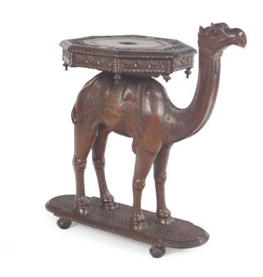 in the form of a standing camel, its saddle supporting a foliate carved octagonal top, raised on an oblong trellis carved base with turned bun feet