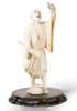 carved as a fisherman with a rake in one hand, holding his catch aloft in the other and with a basket by his feet, on a wood stand