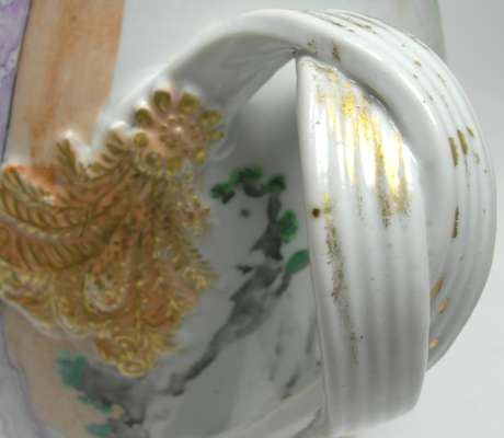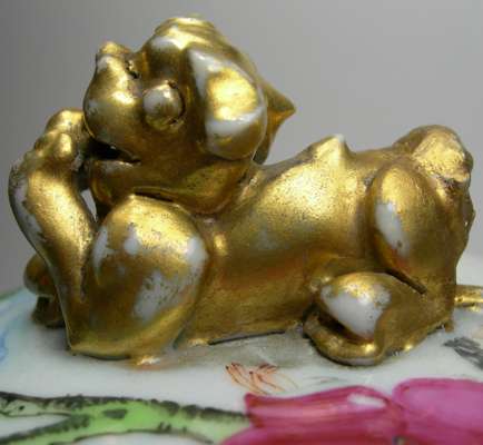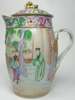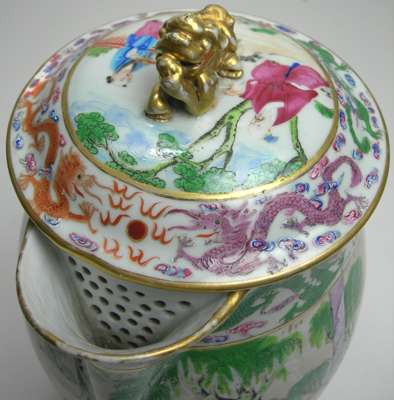 of ovoid form with gilt lion dog finial and gilt leaf and twisted handle, the cover and body decorated with figures in a garden and dragon borders