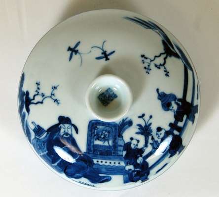 of circular form, decorated to the cover with a sleeping man and children playing in a garden and to the interior of the body with different flowers to each of the six sections, the exterior with a continuous landscape scene