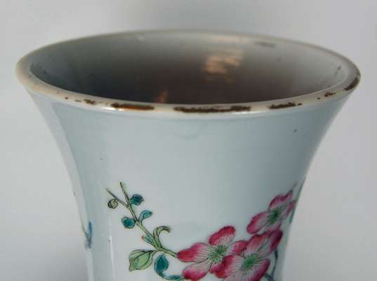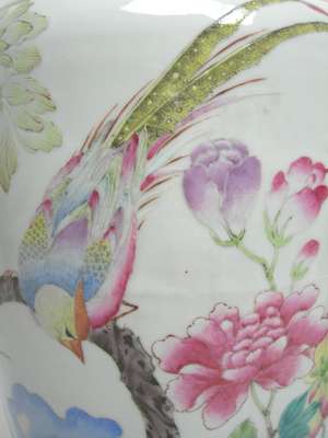 each with slightly flared neck decorated with prunus blossom above shouldered ovoid body, decorated with chrysanthemums, peonies, exotic birds and butterflies (2)