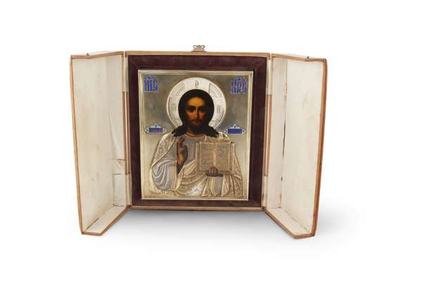 RUSSIAN PAINTED, SILVER AND ENAMEL ICON