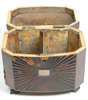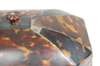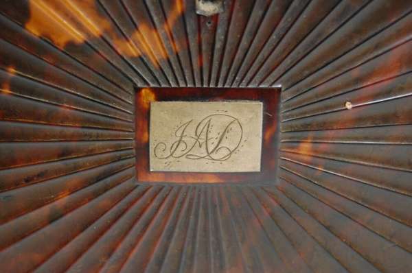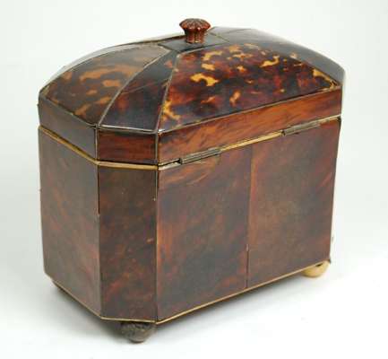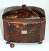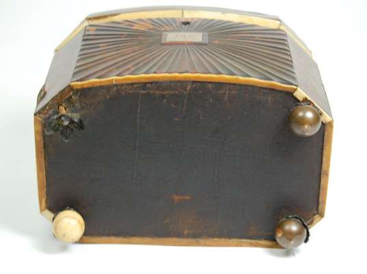 of canted rectangular form, the hinged lid enclosing a compartmented interior, above a bowed radiating fluted front, raised on bun feet, interior lids lacking