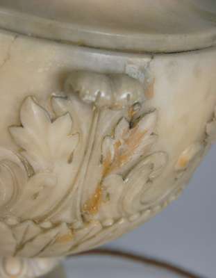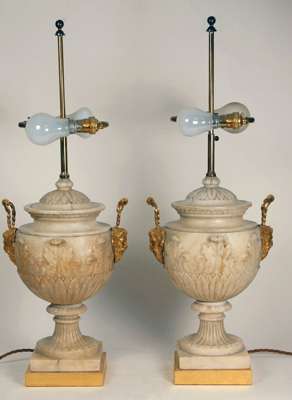 the sides with twin bacchic mask handles and carved in relief with acanthus and stiff leaf decoration, raised on a fluted socle foot, now fitted as lamps (2)