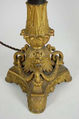 the lappet clad stems surmounted by three outscrolling branches, the central nozzle now fitted for electricity, raised on cast triform bases (2)
