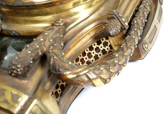 the gilt circular dial with white enamel chapters and an 8-day bell striking movement, the shaped case ornamented with ram's masks, berried laurel leaf swags and flaming urns