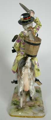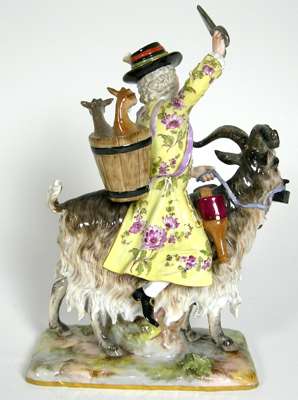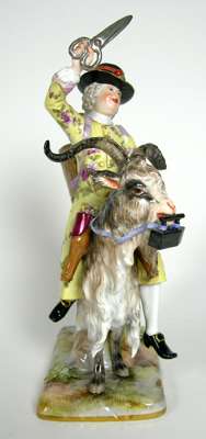 seated on a goat which holds a flat-iron in its mouth and has a pair of upturned wine bottles over its shoulders, the figure with a pair of scissors raised in his right hand, carrying a pair of goats in a bucket on his back and wearing a floral sprigged yellow coat, underglaze blue crossed sword mark, incised 171