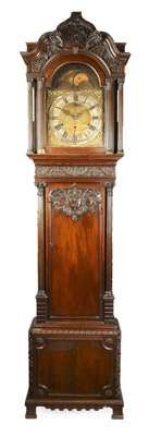 the brass moonphase arched dial with silvered chapter ring and pierced spandrels, the three train 8-day movement with anchor escapement and striking on two bells, the arched hood with a broken swan neck pediment, fret pierced frieze and Corinthian pilasters, the carved case centred by a coat of arms, and flanked by further Corinthian pilasters, raised on ogee bracket feet