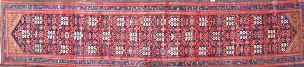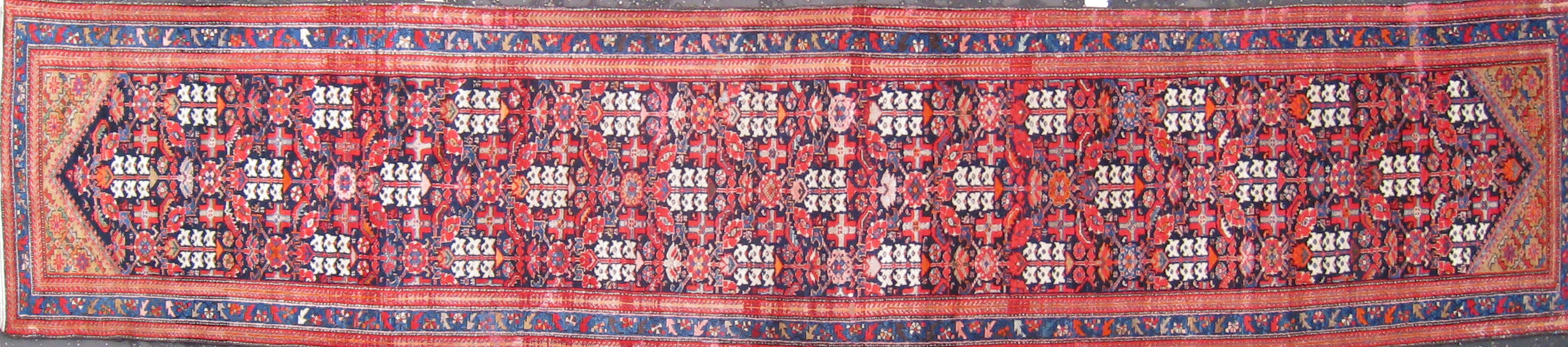 the indigo field with allover gol hennae pattern, camel spandrels, within narrow blue stylised vine border between red bands