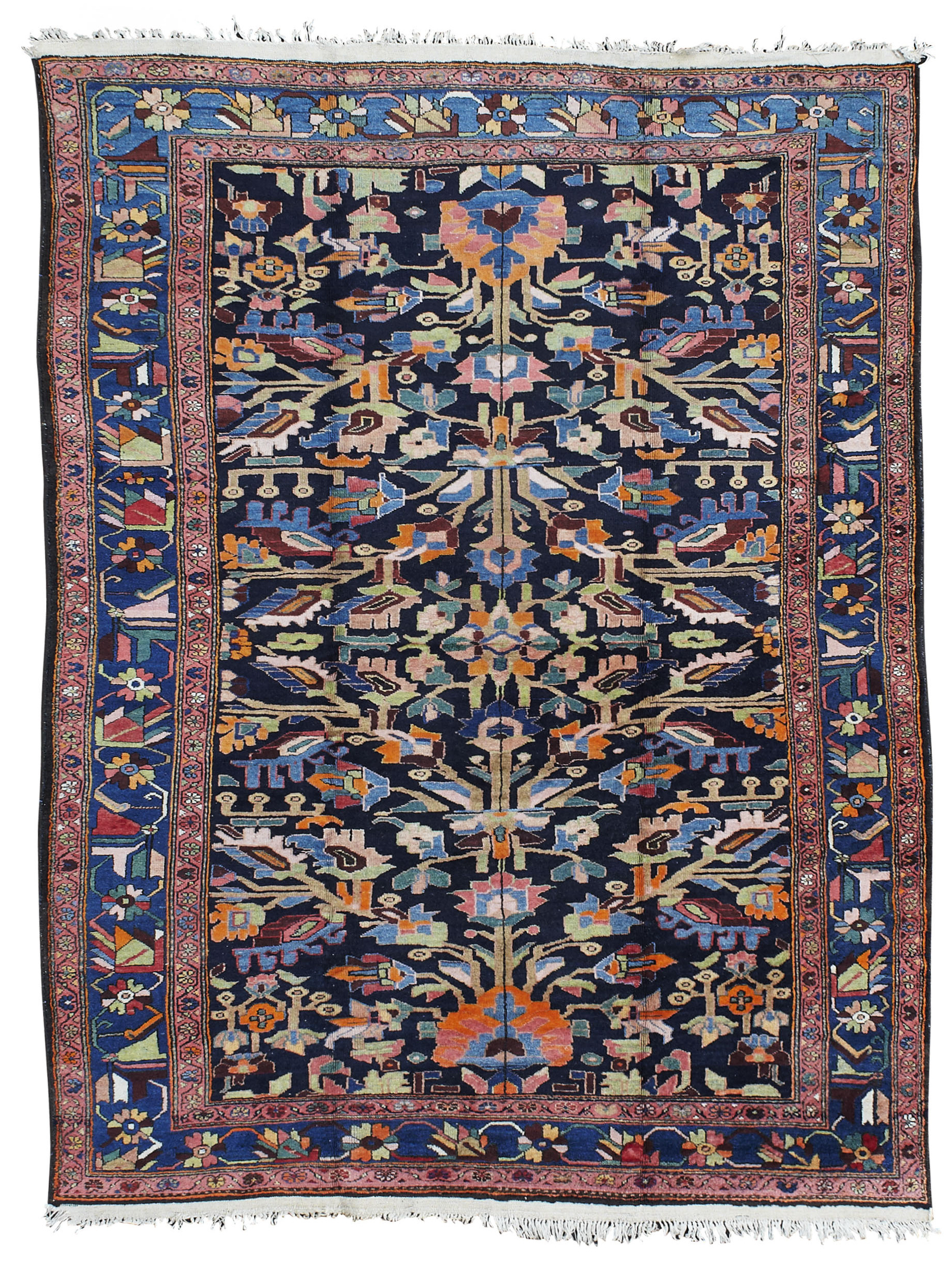 the indigo field with allover stylised foliate pattern, within blue rosette and stylised vine border between pink bands