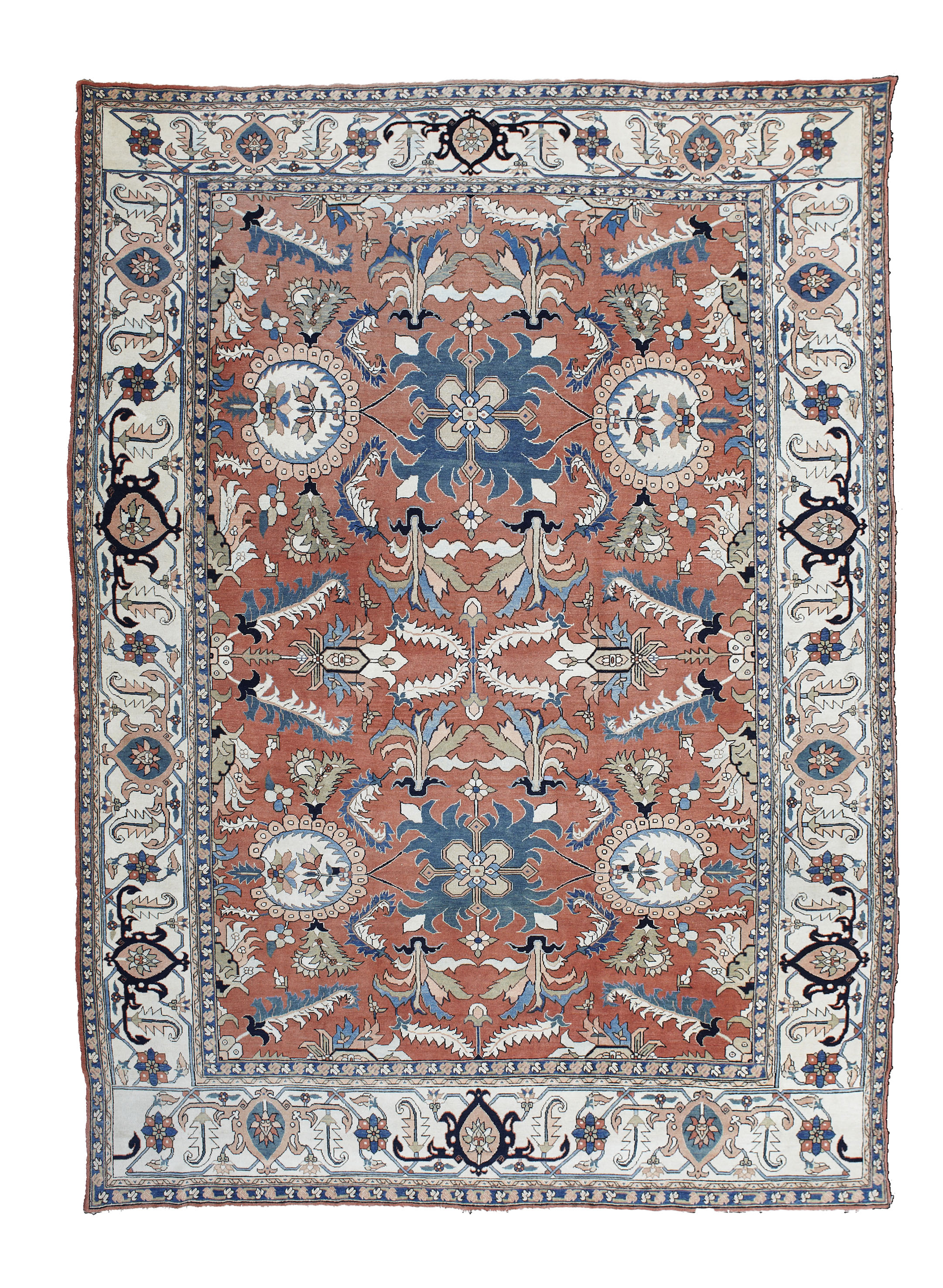 the brick red field with allover large foliate pattern, within cream turtle palmette border between blue bands ALTERATION TO DATE: LATE 20TH CENTURY