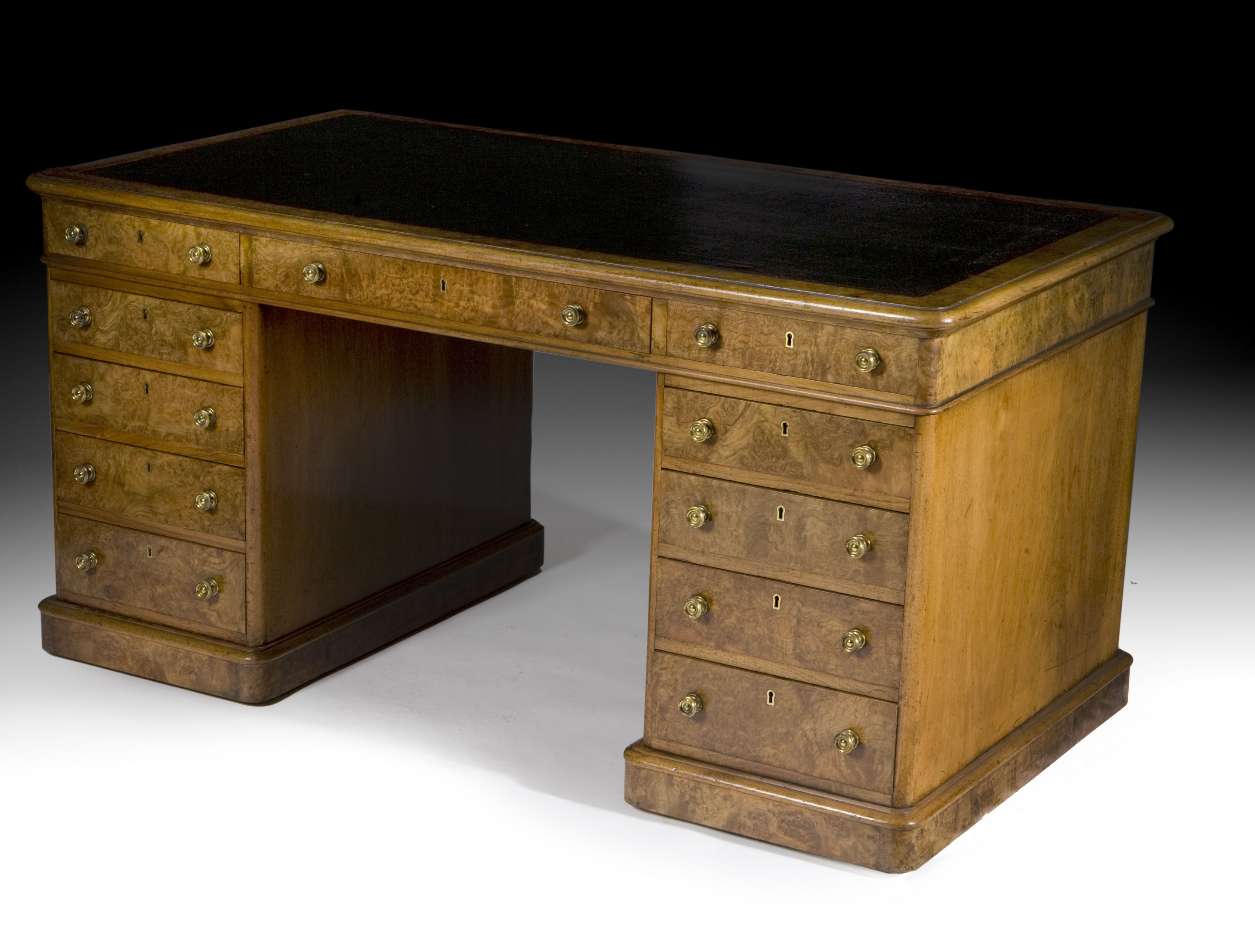 GOOD VICTORIAN BURR WALNUT PEDESTAL DESK