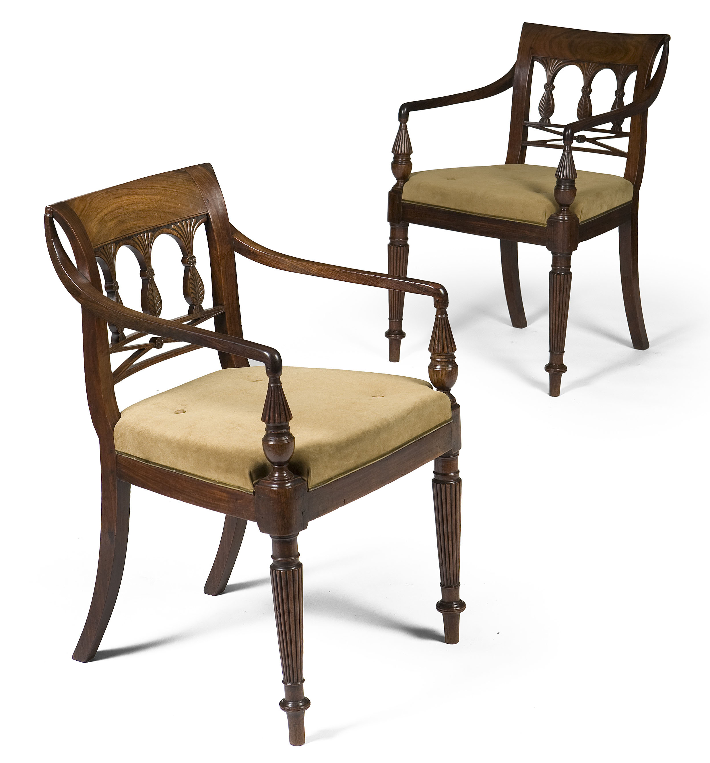the bar backs with palmette carved splats, the scrolling downswept arms above stuffed over seats covered in buttoned suede, raised on reeded turned tapering legs