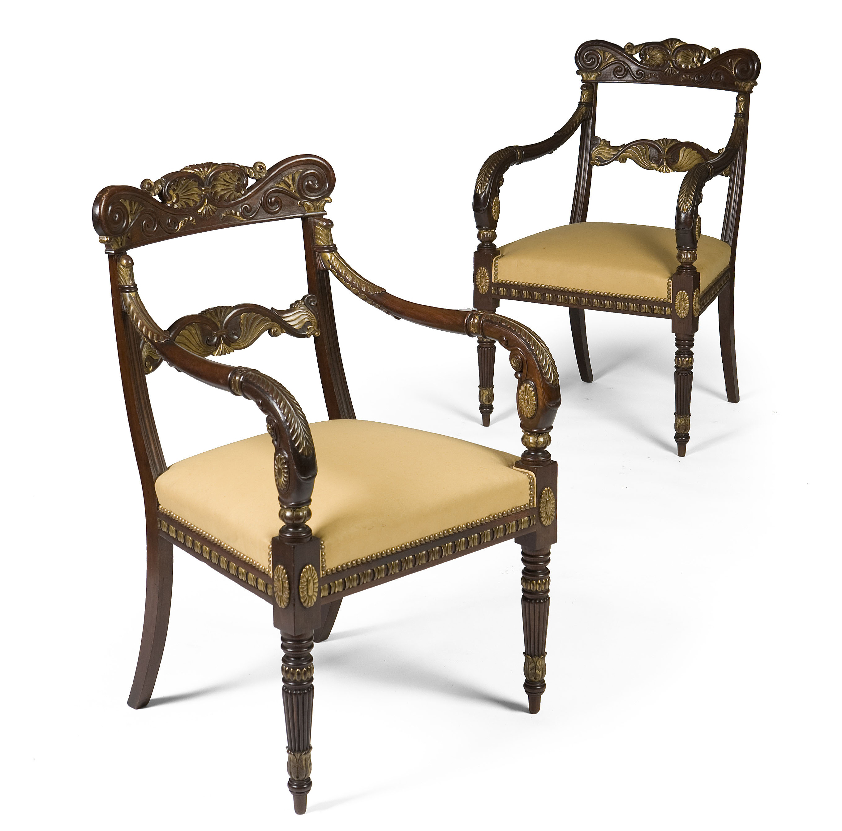 the ornate shell and foliate scroll carved bar backs and gadrooned downswept arms, above stuffed over seats covered in studded gold fabric, raised on reeded turned tapered legs, each stamped 'Peters Maker Genoa'