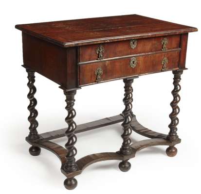 the moulded top above two long drawers, raised on spiral turned legs united by a shaped peripheral stretcher and ending in bun feet