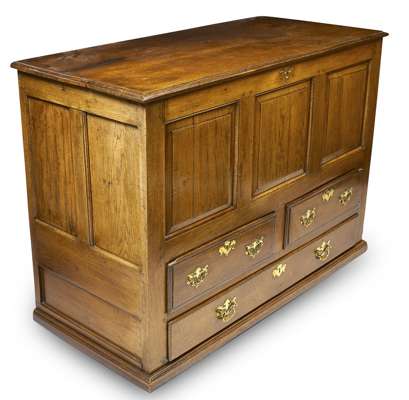 the moulded hinged lid opening to reveal a void interior, above a triple panel front, two short and one long apron drawer, raised on a plinth base