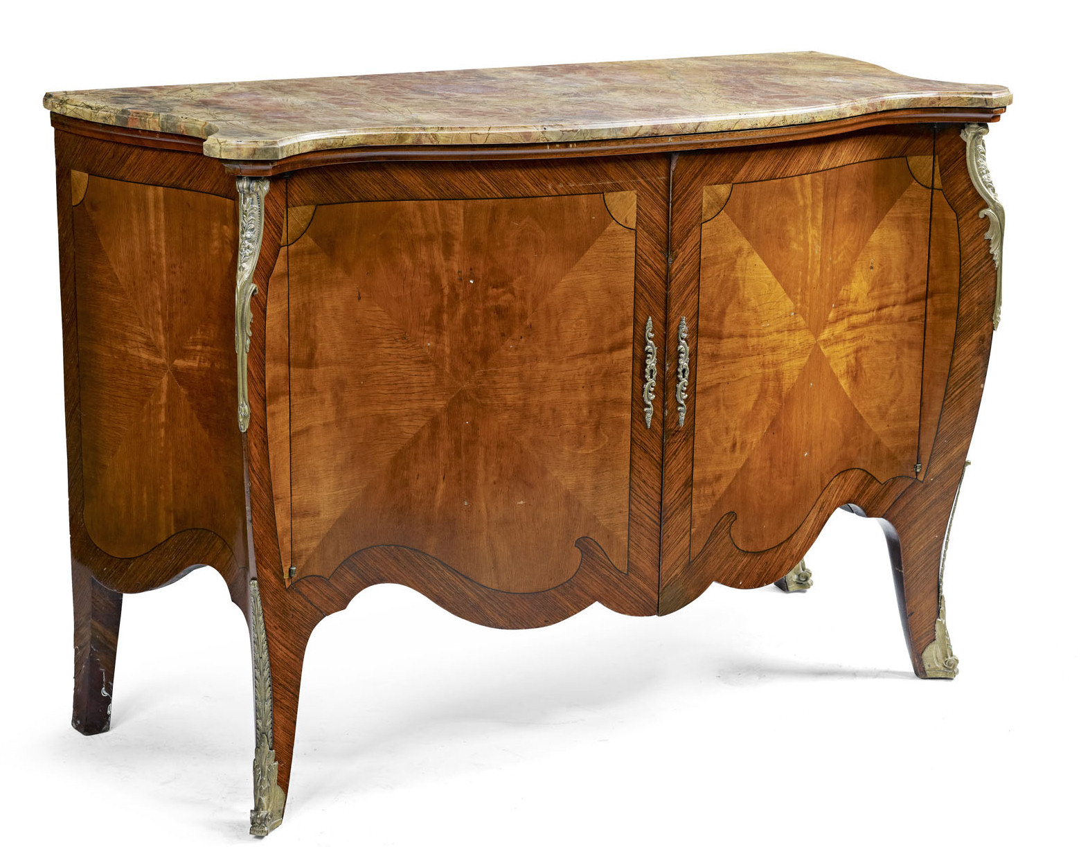 LOUIS XV STYLE KINGWOOD AND GILT BRONZE MOUNTED MARBLE TOP BOMBE COMMODE