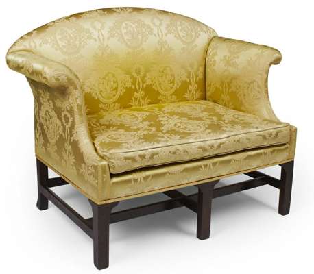 the arched back, scroll arms and loose cushion seat covered in foliate patterned gold fabric, raised on square chamferred legs united by stretchers
