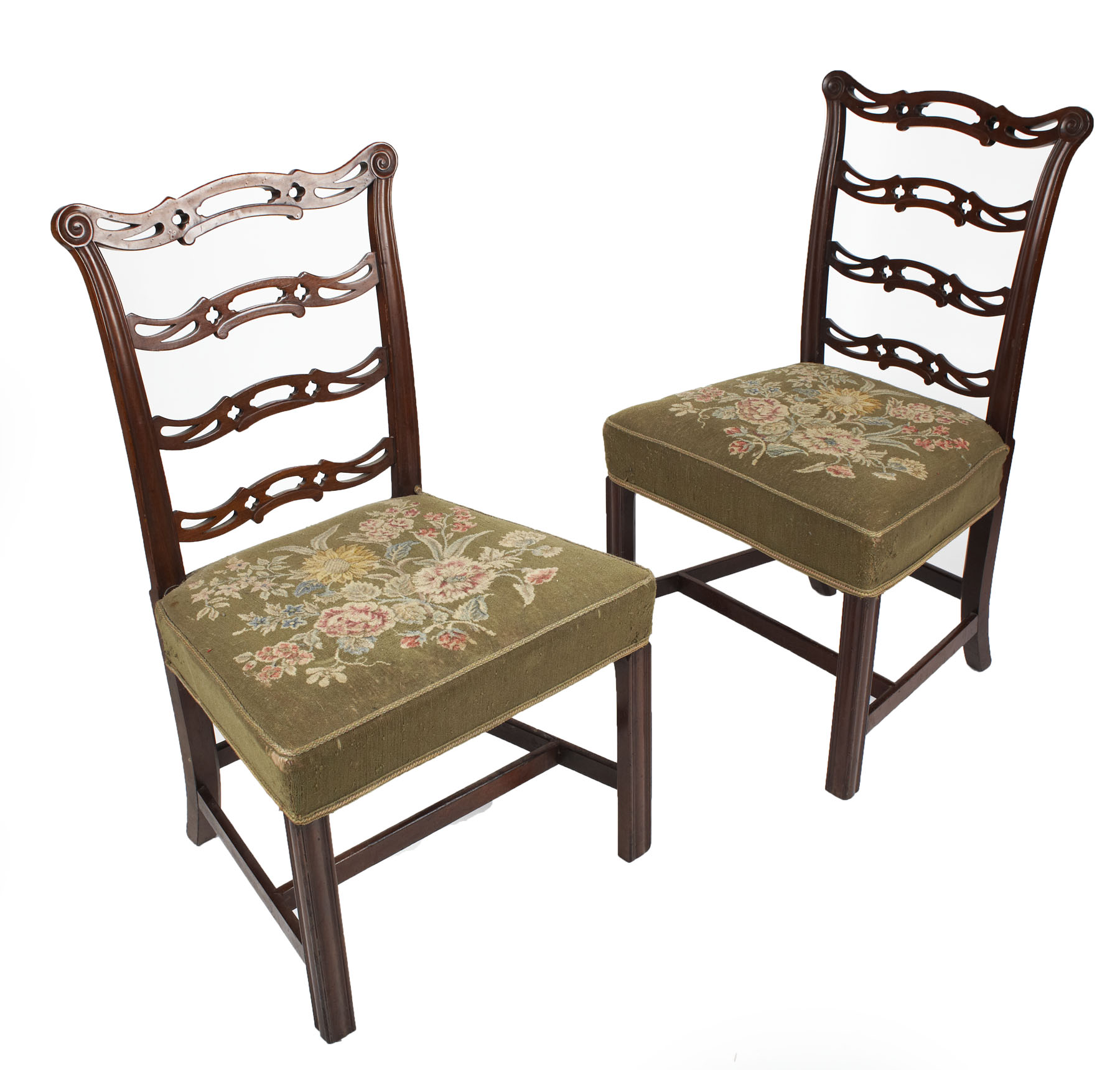 the pierced shaped backs above stuffed over seats covered in foliate tapestry, raised on moulded square chamferred legs united by H-stretchers