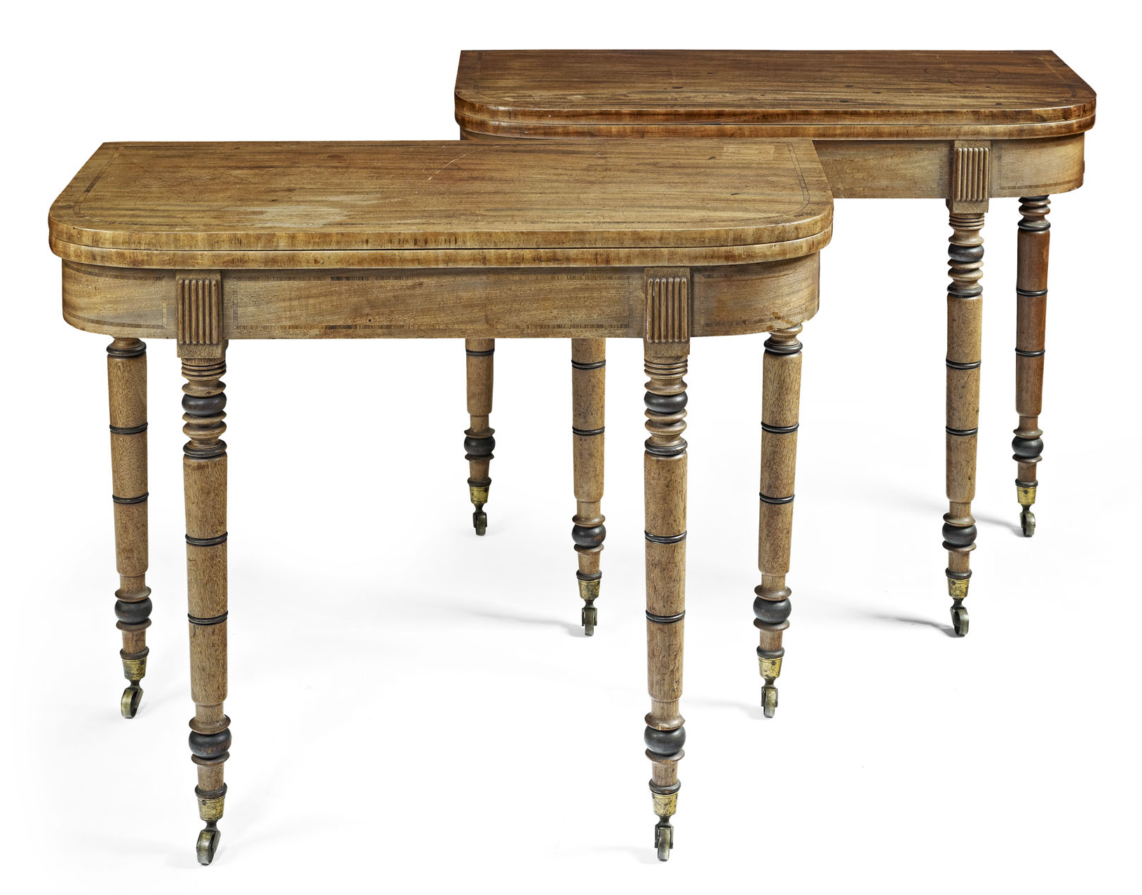 the D shaped foldover tops above gentle breakfront friezes, raised on ring turned legs terminating in brass caps and castors (2)