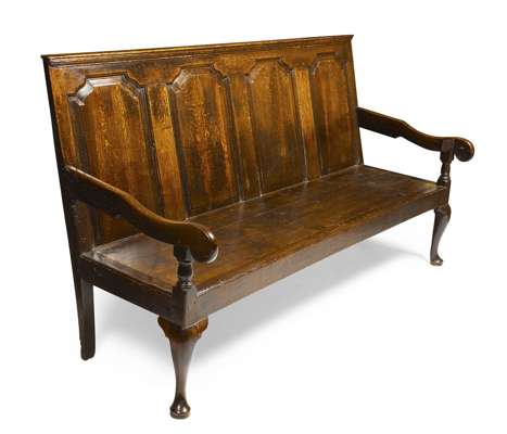 the quadruple arched fielded panel back with scroll arms, above a later plank seat, raised on cabriole legs with pad feet