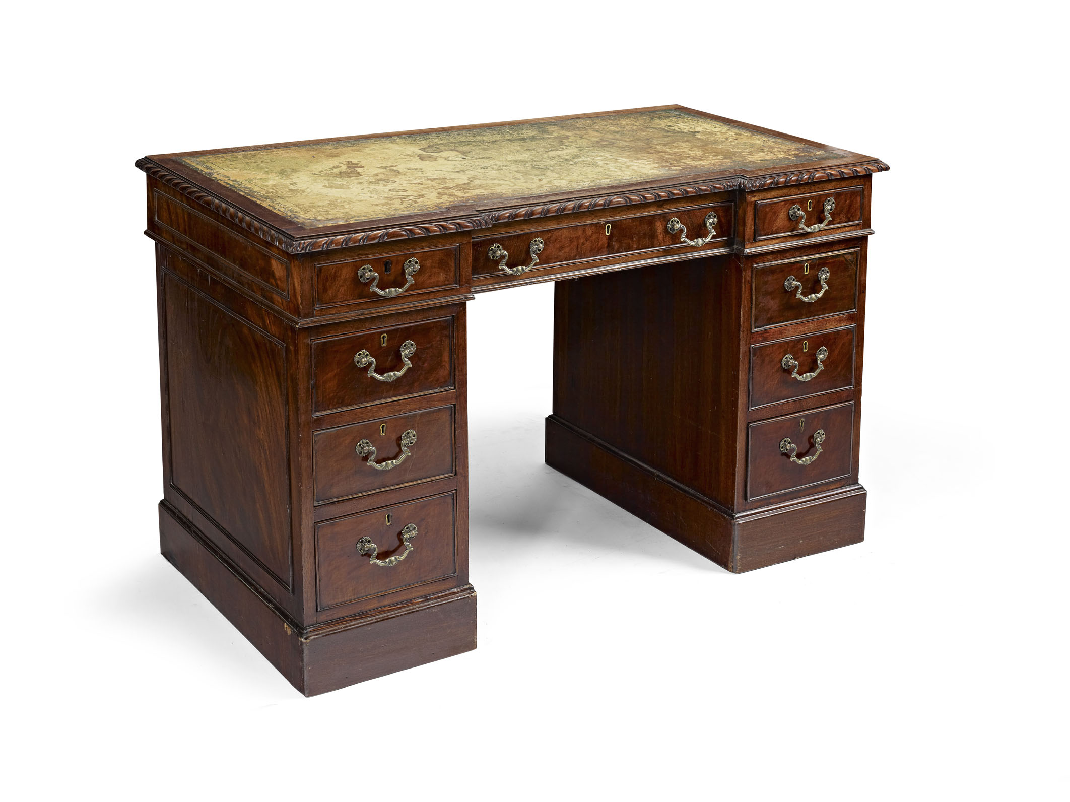 the inverted breakfront top with a gadrooned edge, an inset leather writing surface, above three frieze drawers with three further drawers to each pedestal support, ending on plinth bases
