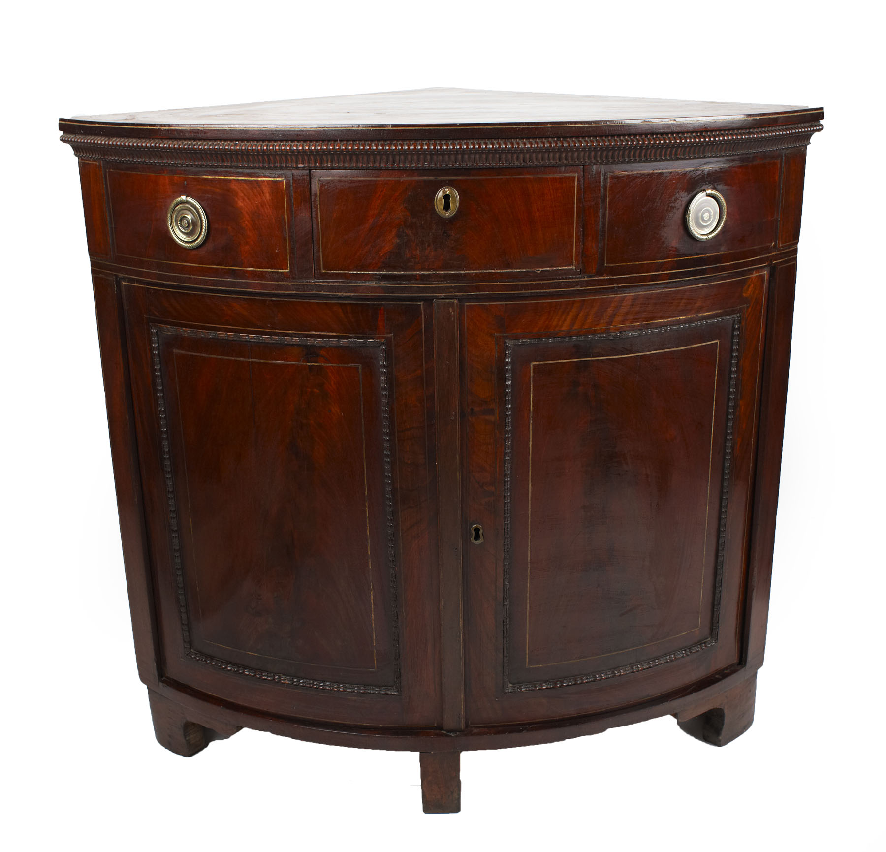 DUTCH MAHOGANY AND BRASS INLAID CORNER CUPBOARD