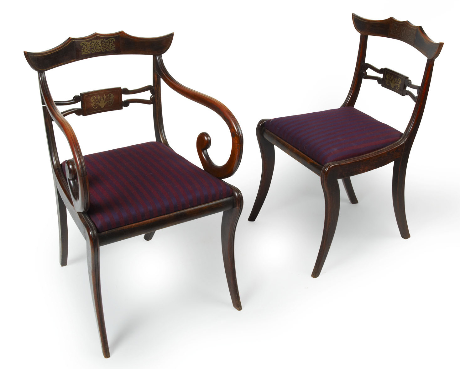 including two armchairs, the shaped brass inlaid bar backs above drop-in trafalgar seats, raised on sabre legs (6)