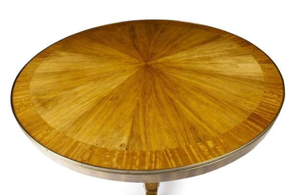the circular satinwood banded top with radiating veneers and a brass edge, raised on a square baluster stem and quatreform base, with carved claw feet terminating in brass castors