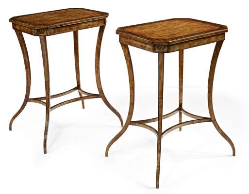 the canted rectangular tops inlaid with a band of scrolling foliage, raised on four square tapered sabre legs, united by a shaped stretcher (2)