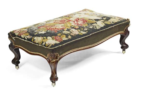 the serpentine seat covered in foliate patterned needlework, raised on cabriole scroll legs ending in ceramic castors