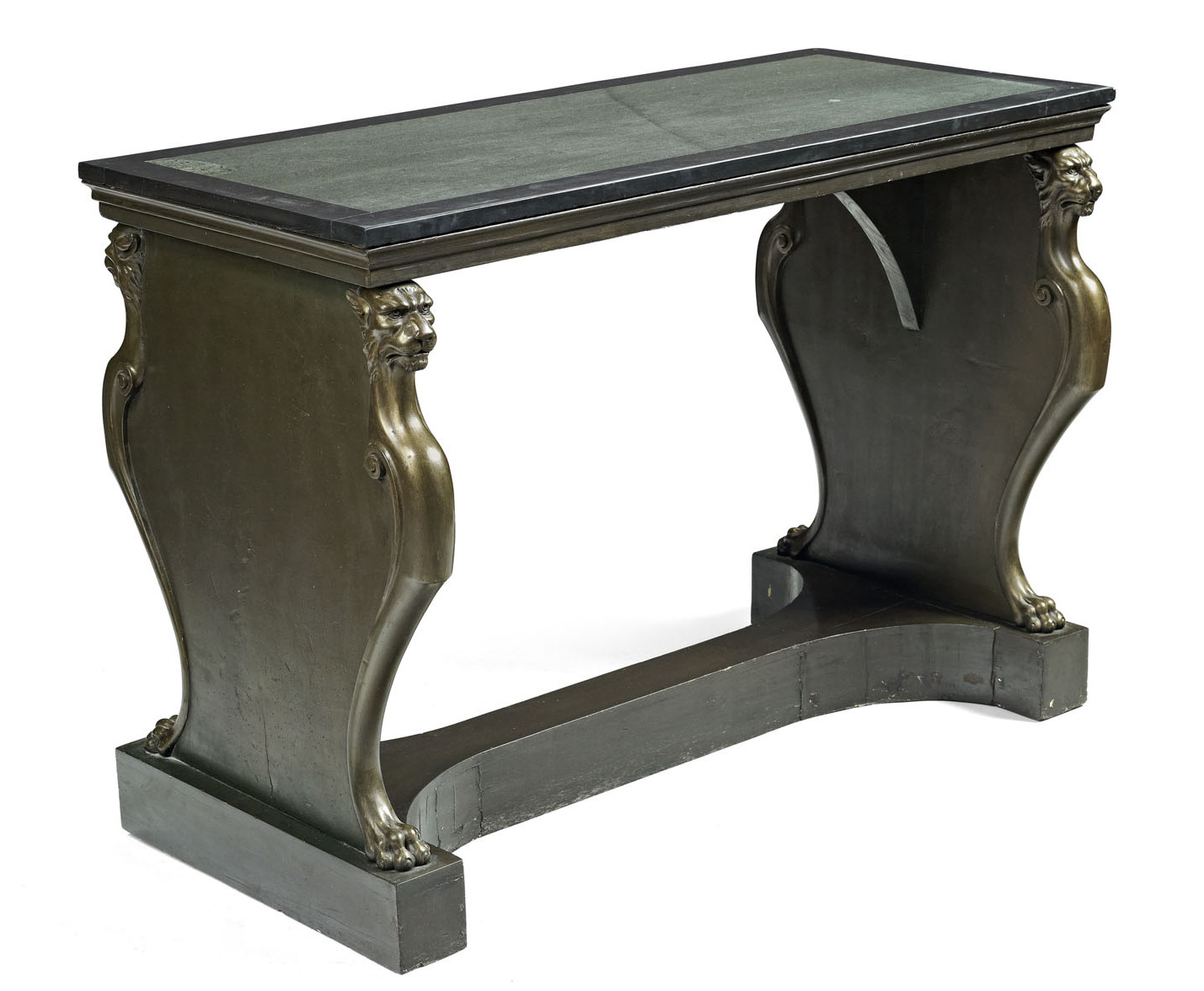 the specimen marble top above a moulded frieze raised on twin shaped trestle end supports carved with lion's mask stylised caryatid facings, raised on an H-shaped plinth base
