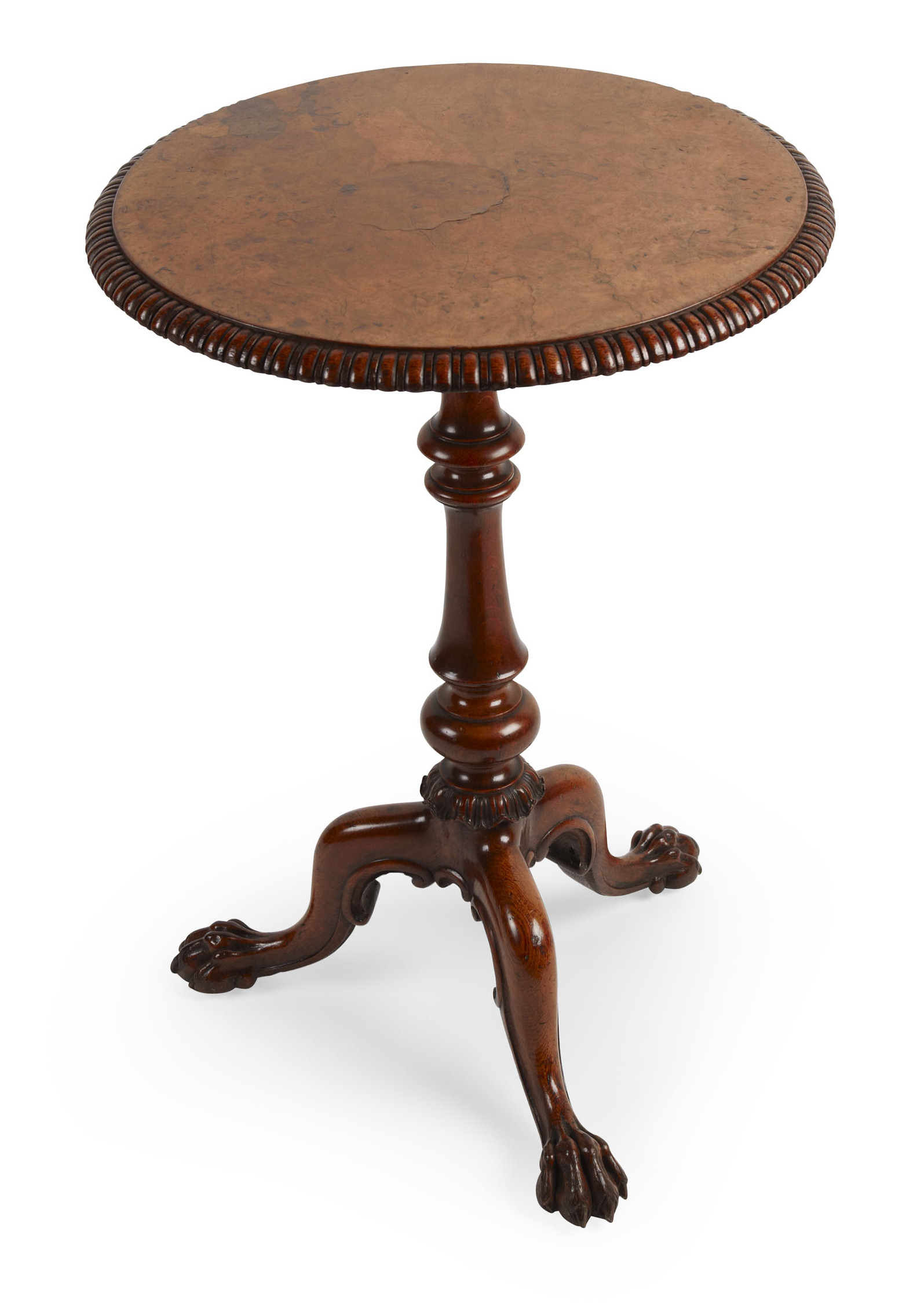 the circular top with a bead moulded edge, raised on turned column support ending in a tripod base with carved claw feet